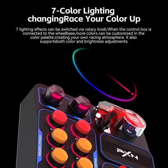 The PXN CB1 Gaming Button Box is a programmable racing accessory for PC sim racing setups. It features multiple buttons, rotary switches, and LEDs to provide quick and customizable in-game controls, ideal for advanced racing simulators like iRacing, Assetto Corsa, and rFactor.