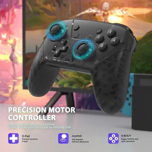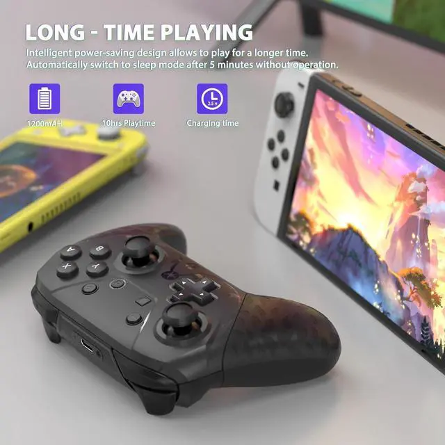 Long life battery and USB-C reversible charging port: The battery life of the built-in rechargeable power source is amazing, requiring only 2.5 hours of charging time and up to 10 hours of playtime. It comes with a 40-inch Type-C cable, which works fine even during charging. The Pro Switch controller uses an irregular pattern design, in addition to its beautiful, it also has the characteristics of anti-slip and anti-sweat. What's more, the Pro controller makes portable games like console games.