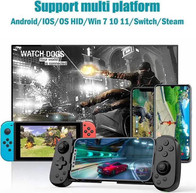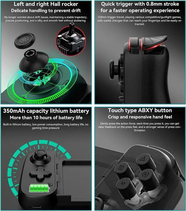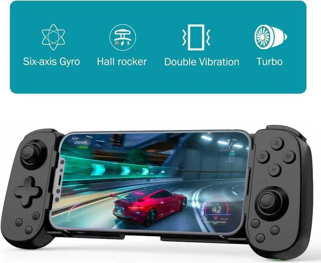 Mobile phone game controller features sensitive thumbsticks and is configured with Bluetooth 5.0 EDR/BLE for a simple connection and almost no latency, providing the best gaming experience. Support PC, Xbox, switch, Ps game console popular games. Mobile gaming controller with 6-axis, double vibration and Turbo function.