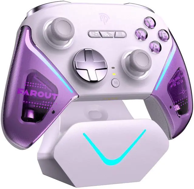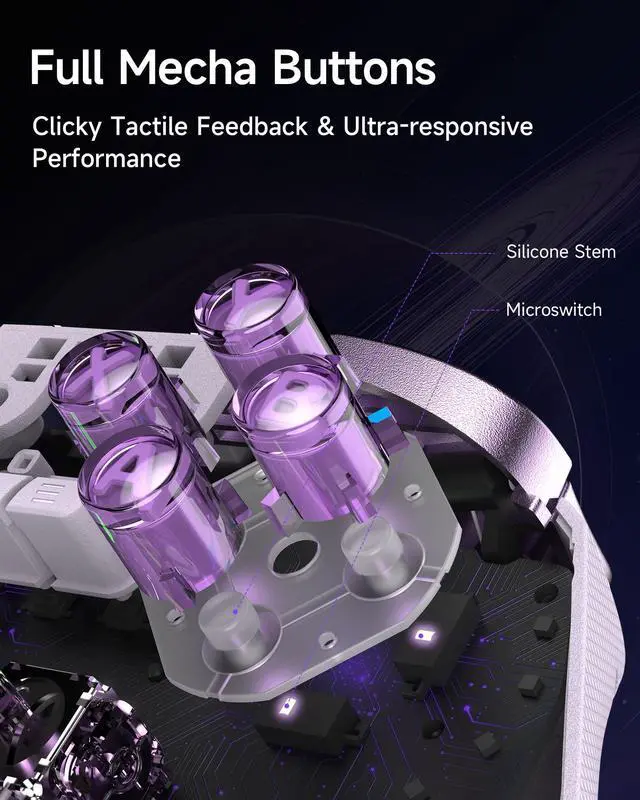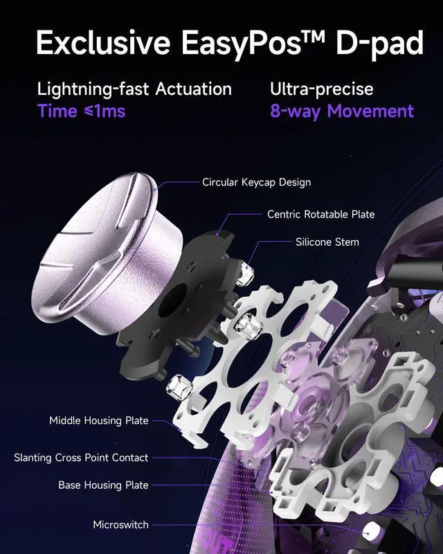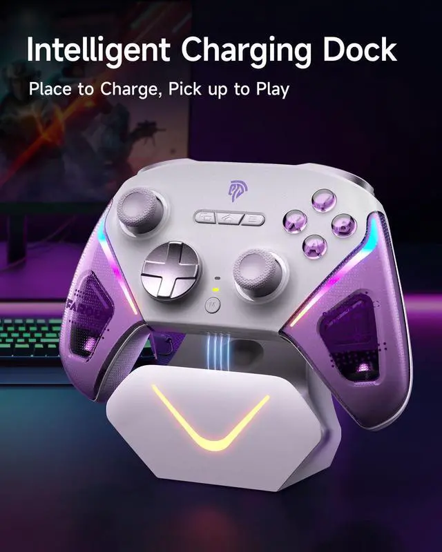**Note**: Compatible with Windows PC, Android, Switch, and iOS. **Not compatible with Xbox, PlayStation, Luna, or GeForce Now.** Next-gen TMR SticksPrecision-engineered TMR Joysticks, offering higher sensitivity and precision than traditional Hall Effect sensors, with 5 million+ cycles durability to eliminate stick drift for competitive FPS/racing games. Elite Dual-Mode TriggersSeamlessly switch between Hall Effect linear triggers (ideal for racing/shooting) and micro-switch tactile triggers (optimized for fighting/action), delivering faster input recognition for diverse gaming scenarios. Exclusive EasyPos D-padPowered by EasySMXs exclusive EasyPos technology, the D-pad ensures lightning-fast, millisecond-level response and ultra-precise 8-way movement control. Full Mechanical Buttons Fully mechanical micro-switch buttons with 1.0mm actuation and 5 million+ click lifespan, providing tactile feedback akin to premium gaming keyboards. Intelligent Charging DockMagnetic dock charges the 1000mAh battery in 2.5 hours, includes 2.4G dongle storage for a clutter-free setup. Place it to charge, pick it up to auto-reconnect. D10 always keep powered and ready to play effortlessly. Solid 1000Hz Polling Rate (Wired/2.4G)Ultra-low latency with 1000Hz polling rate in wired and 2.4G wireless modes, ensuring instant input response for competitive gaming. Additional FeaturesCustomizable RGB Lighting 2 Programmable Back Butto