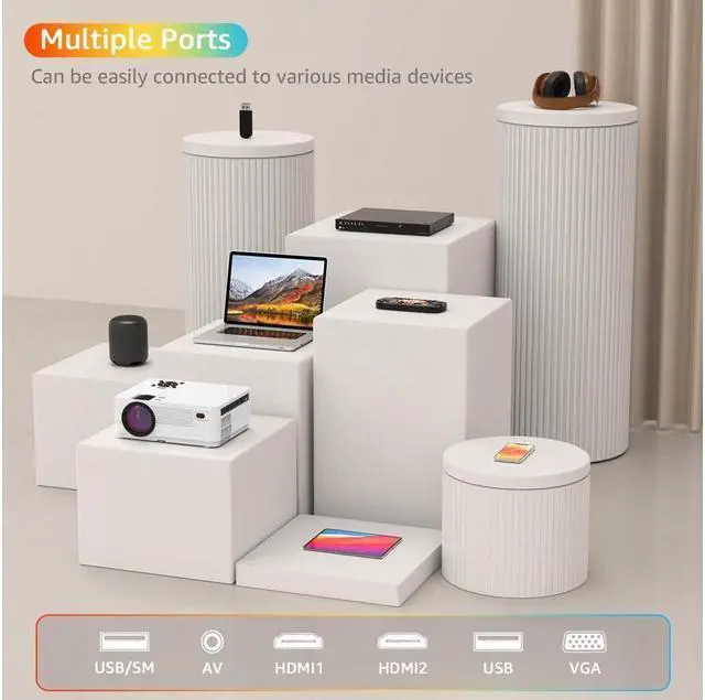 300" Large Projection and Wide Compatibility: The largest 300" large screen brings you a brilliant widescreen visual experience to create an IMAX private theater! multifunctional portable projector is equipped with HDMI, USB, USB-SM, AV, and 3.5 mm audio jack. Compatible with TV boxes, DVD players, smartphones, tablets, PS5, USB disks, HDMI enabled devices, and Bluetooth speakers. Supports mounting to ceiling, wall, desktop, and stand projection for all your indoor or outdoor needs!
