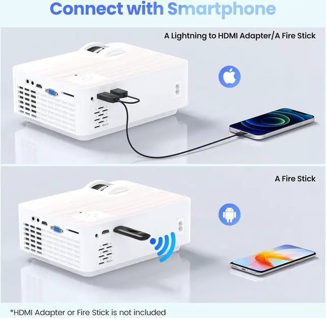 " Our portable projector offers giant display size from 40 to 200 inches at 5 to 18 feet, adapting to any room size or setup. The convenient 50% zoom function (Only when using USB) allows you to adjust the image size without moving the iphone projector, giving you more control over the viewing experience and accommodating various viewing distances