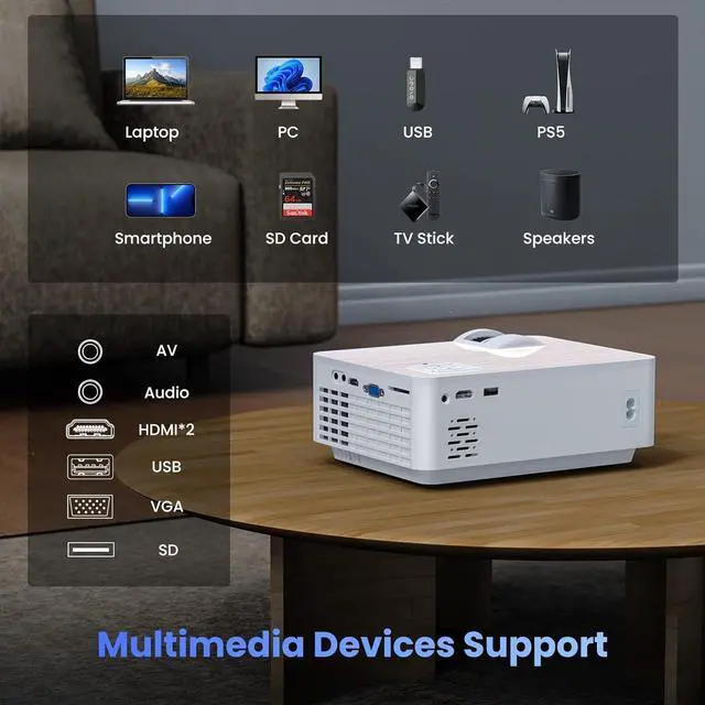 The HDMI, VGA, USB and SD ports of the outdoor movie projector makes it compatible with a variety of electronic devices, including smartphones, laptops, tablets, USB flash drives, game consoles, media players, and more. The projector with bluetooth is perfect for home entertainment, backyard, gaming, yoga, or party