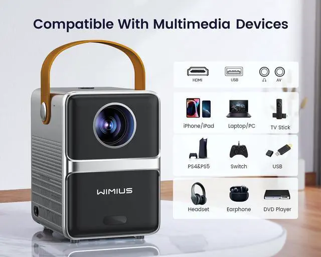 Multi-device Connection & Reliable After-SalesThis home theater projector is equipped with HDMI/USBx2/AV/ 3.5 mm headphone jack, compatible with Fire TV Stick, Chromecast, Roku, DVD, Laptop, USB, External Speaker, iPhone Android, iPad, PS5, etc. You can use the mini portable projecteur for garden parties, home theater, outdoor camping, and yoga. Any questions, please feel free to contact us via after-sales email, WiMiUS promises 24/7 service, 2-year free replacement and lifetime support.