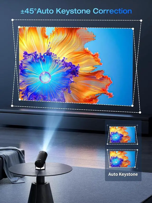 180° Rotatable Projector & ±45° Auto Keystone CorrectionOur projector effortlessly adjusts to project onto walls, ceilings, or even the floor with its 180° rotation feature, delivering an immersive viewing experience from every corner of your home. Benefit from our projector's ±45° Auto Keystone Correction, ensuring a perfectly aligned image regardless of the viewing angle.