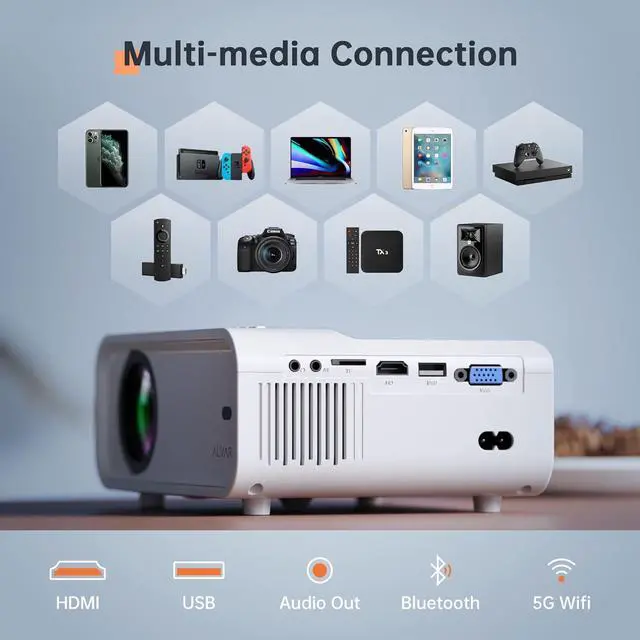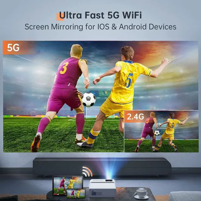 5G & 2.4G WiFi Screen MirroringSelf-adapting 2.4G and 5G mirroring modes. 5G bandwidth can be increased to 40MHz or even 80MHz or higher, transmission speed is up to 1Gbps. You can instantly mirror the movies, photos, or games on your phone to the ALVAR projector with no extra adapters and dongles.