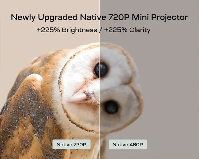 Native 720P, Supports Full HD 1080P Our mini projector features a native resolution of 1280*720 and a brightness of 120 ANSI lumens. It can deliver clear and sufficiently bright images in dark environments, making it ideal for children's entertainment and home cinema. (LCD projectors may have a situation where the edges are less sharp than the center. )