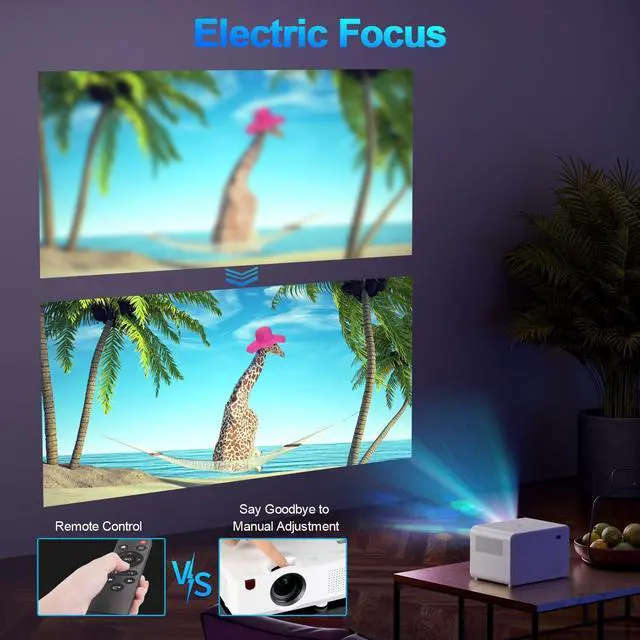 Electric Focus & Zoom FunctionOur mini projector has a more humanized electronic focus function. Using the remote control of the projector, you can get a clear image with one click even if you are on the sofa or bed. It also features a 4:3 / 16:9 aspect ratio and a 50% - 100% zoom function that allows you to scale the image without moving the projector.
