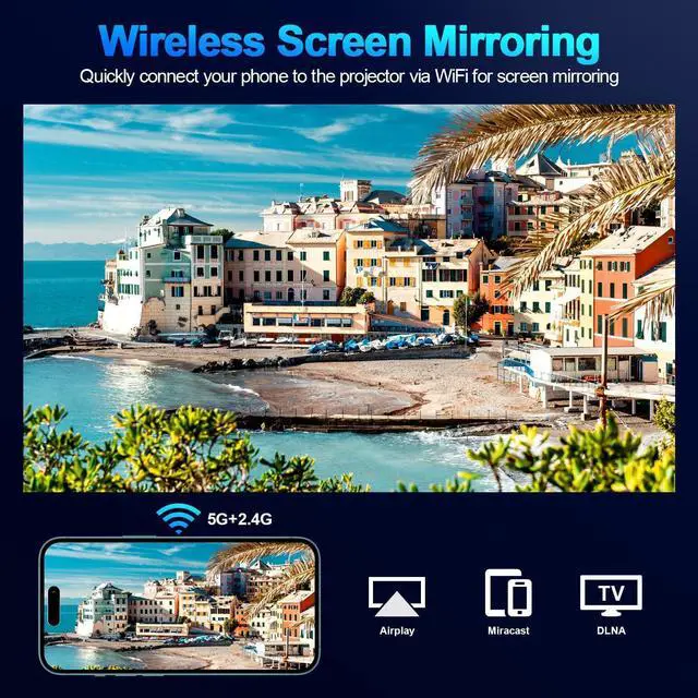 2.4 +5G WiFi & Bluetooth 5.1W ith advanced 2.4G /5G dual WiFi technology, easily connect your device and projector together. Wirelessly mirror your iOS/Android phone screen to the projector via AirPlay/Miracast/DLNA, faster and smoother, say goodbye to wired connection. With Bluetooth 5.1, easily connect the projecteur to Bluetooth speakers for an amplified audio experience.