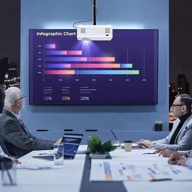 Low noise and stylish portable projectorThe innovative cooling system and heat suppression technology eliminate 85% of the noise, bringing you an ultra-quiet viewing experience. The built-in stereo sound chamber provides you with a bright and full sound effect, and you can also connect your external speaker device to enjoy the cinema-grade configuration at any time. This portable movie projector brings the ultimate in convenience with a sleek, classic design that fits anywhere.