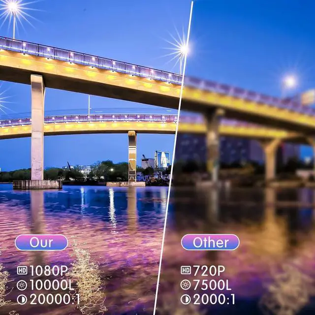 Superior Home Theater Projector: The new generation of projectors Adopt unique large lens design. Enhanced Brightness. Equipped with 10000lumen& 20000:1 high contrast&±15° keystone correction& 16:9 / 4:3 aspect ratio, supported 1080p resolution. The projector is built by advanced color engine and the latest 5-layer LCD lens technology can restore more complex color details. All these functions and features make the projector image sharper and more detailed