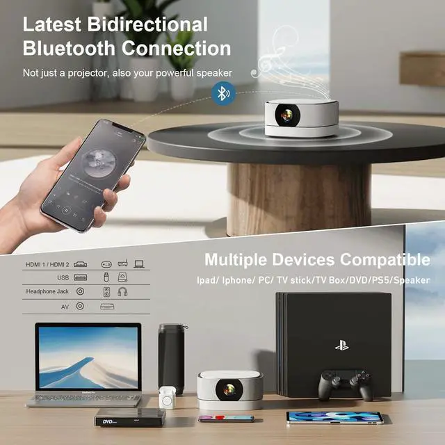 Projector With WiFi And BluetoothLisowod AN1 specifically optimizes network congestion with 5G WiFi tech, also features features two-way bluetooth 5.2 function, connect your bluetooth audio devices at any time and AN1's sound system can also double up as a bluetooth speaker.