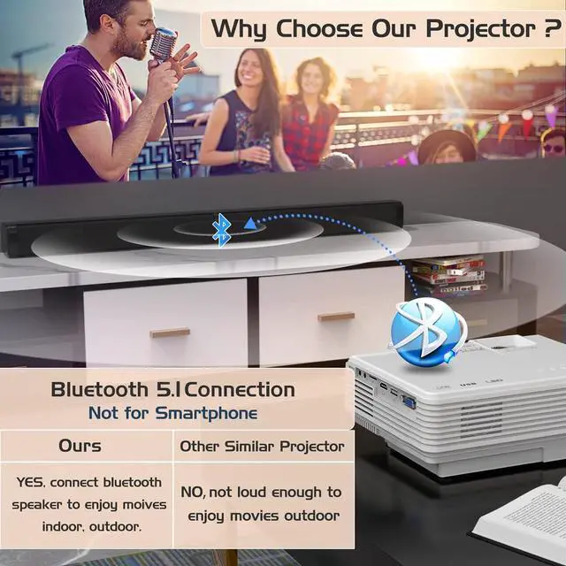 Projector with Bluetooth & Upgraded SpeakerIt is a Bluetooth Projector. You can wirelessly pair with your bluetooth speaker, headphones, soundbar anytime and anywhere. It is a mini projector with bluetooth, you can hook up external speakers, the sound is greatly enhanced and the sound is theater quality. Also, the built-in stereo surround speaker is good enough to enjoy the pleasure sounds in different scenes, if you don't want to add another speaker.