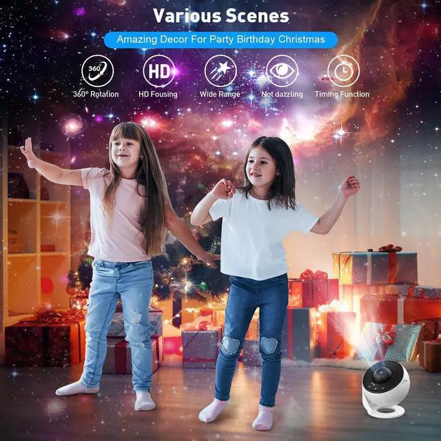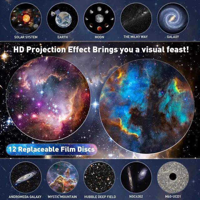 HD Realistic Planetarium ProjectorThis Planetarium Star Projector comes with 12 film discs of planets and natural lights. HD galaxy lights will fill walls and ceilings with stars and nebulae, creating an immersive experience as if you are in a galaxy. You can use night lights in your bedroom to create a mystical night, a star-filled nebula planetarium space area.