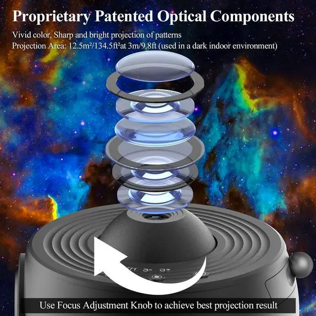 4K HD Projection & Adjustable Focus- The star projector has a high-definition optical lens, which can project clear and high-resolution images. Rotating the top focusing head to adjust image clarity regardless of the projection distance. Support a projection distance of up to 16.4 ft and an area of 754 sq ft. It has a 360° rotation function, which allows you to easily adjust the angle of the projection. the solar system projector can be projected onto the ceiling, walls, and floors. The starry sky night light can be used not only in the bedroom but also in the living room, creating a romantic atmosphere.