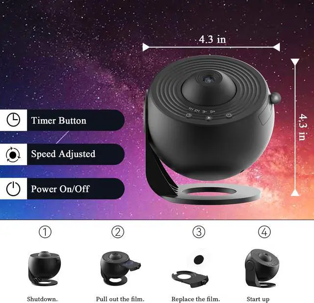 Ultra-quiet Sleep Aid & Automatic Shutdown Timer- This star projector galaxy light operates silently, ensuring a peaceful environment for sleep. You can rely on the built-in timer function to automatically turn off the space projector, eliminating any worries of forgetting to do so. The galaxy lamp creates a serene and tranquil sleeping atmosphere, aiding both you and your child in falling asleep. Please note that the projected image rotates at a deliberately slow pace to accurately simulate the natural rotation of the starry sky.