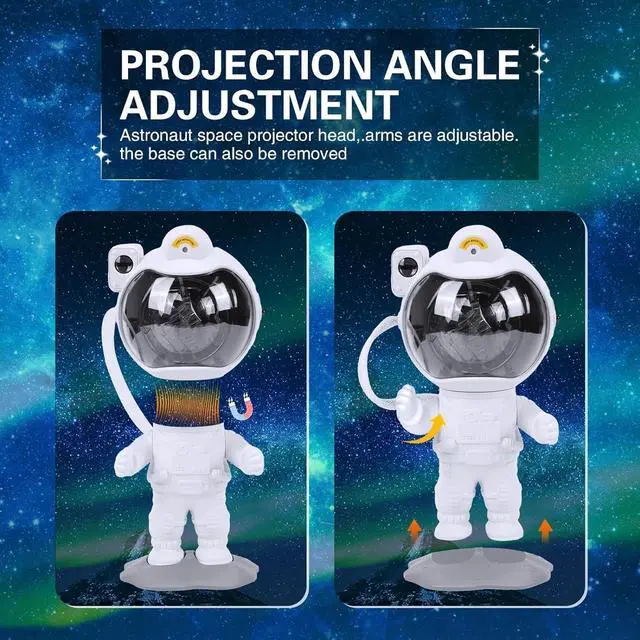 [Projection Angle Adjustable] This night light starry projector is designed to look like an astronaut, and the astronaut's head is magnetically connected to the body for easy adjustment of the nebula projection angle. In addition, the moon base is removable and the arm can also be posed, which makes it not only a galaxy star projector but also a good-looking decorative ornament.