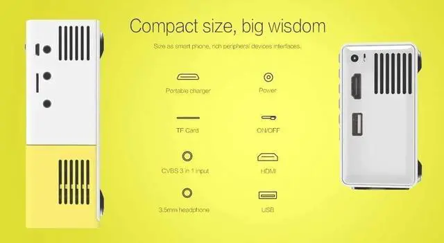 Mini Projector: 4.7 * 3.4 * 1.9 in mini Size and weight just 595g also with Pretty cute appearance make it very compact and portable. It's very easy to carry to where you want, you can easily place this in a bag, suitcase without it taking up too much room as well as being able to store it away in a draw, cupboard in the home. (The old and new models are shipped randomly. )