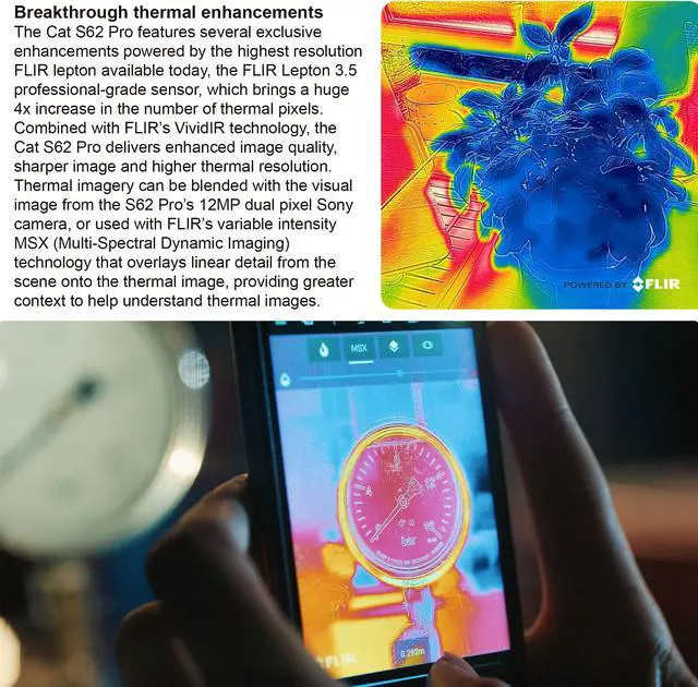 Combined with FLIR's VividIR technology, the Cat S62 Pro delivers enhanced image quality, sharper image and higher thermal resolution.