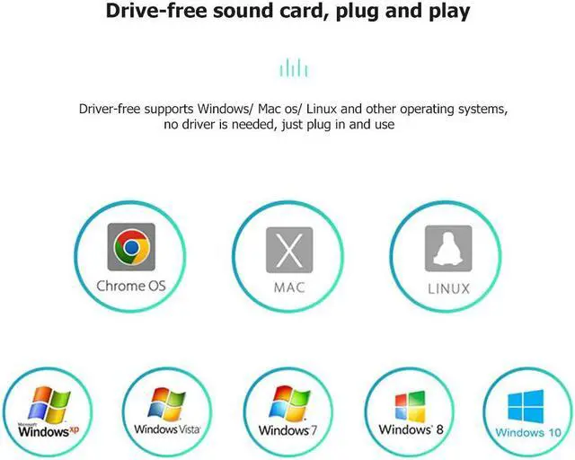 Driver-free sound card, plug and play, supports for Windows/ for Mac OS/ for Linux and other operating systems, no driver is needed, just plug it in and use it.