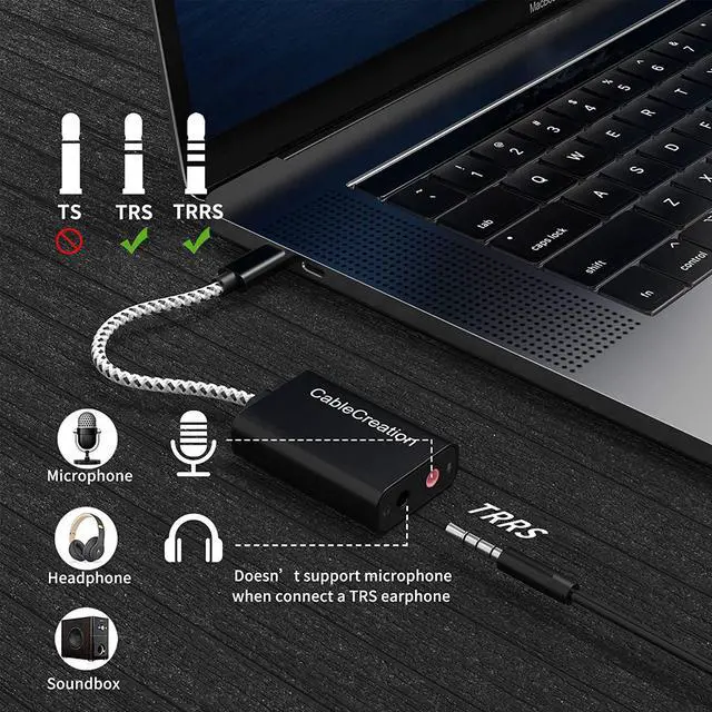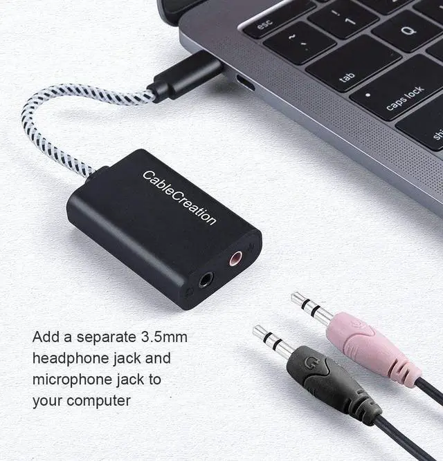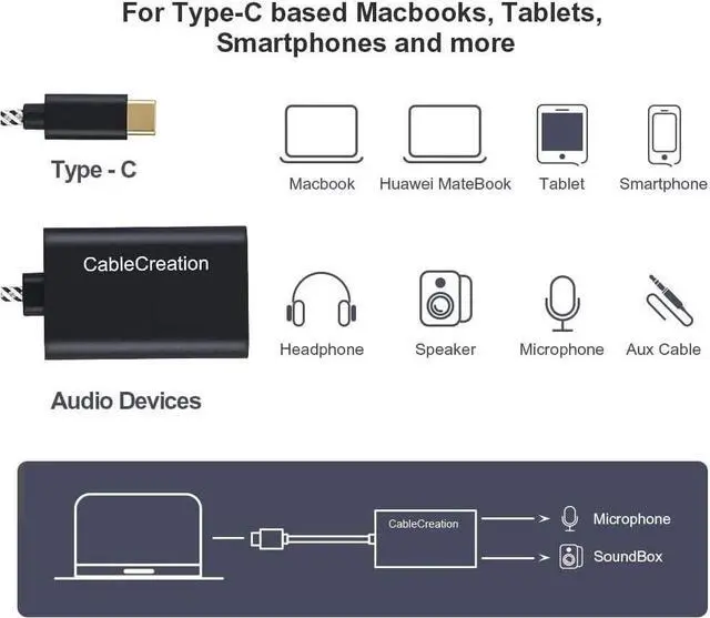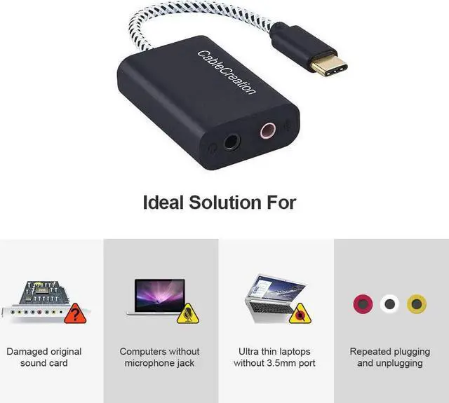 Sound Card Solution CableCreation USB-C to audio adapter is an ideal solution for an external sound card. It enables your USB Type-C/Thunderbolt 3 equipped computers or cellphones to connect an existing 3.5 mm microphone, headset, speaker, etc. You do not need to buy an expensive USB-C earphone to match your new USB-C computer or cellphone
