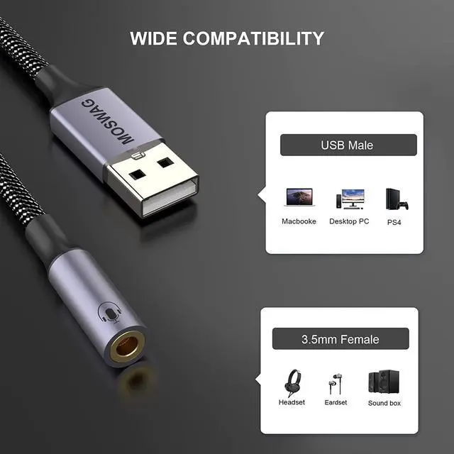 Plug and Play: USB Sound Adapter no driver required, USB headset adapter plug and play; the durable nylon braided cable of the USB audio adapter ensures stable transmission and allows you to use your 3.5 mm headphones more conveniently. USB to 3.5 mm port will be automatically recognized by system in seconds.