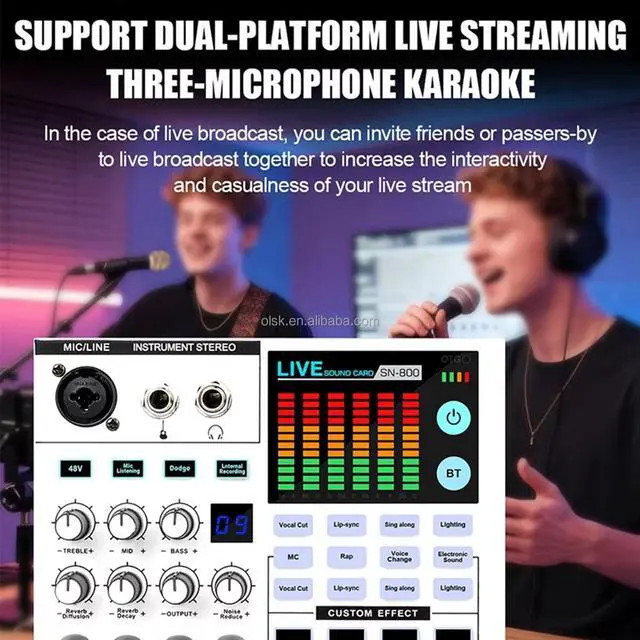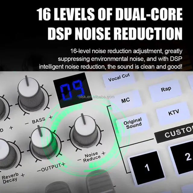 1. Supports 11 volume settings (high, medium, and bass, reverb length, reverb volume, recording volume, noise reduction, microphone volume, music volume, instrument volume, and monitoring volume).