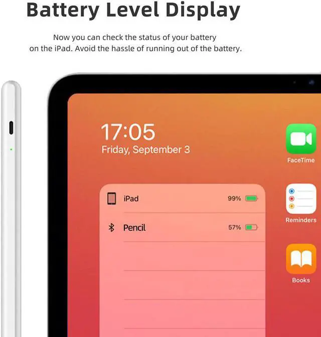 when the Uogic Stylus connects with the iPad, you can check how much power has left on the iPad widget. No more panic of running out of the . Now you can charge the stylus when only exact low . Lower charging frequency to keep the longer health.