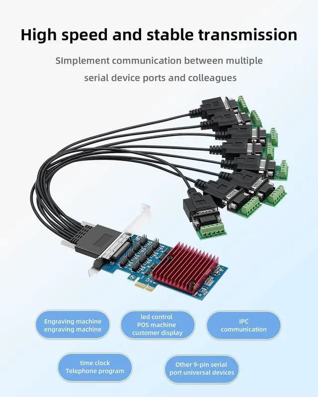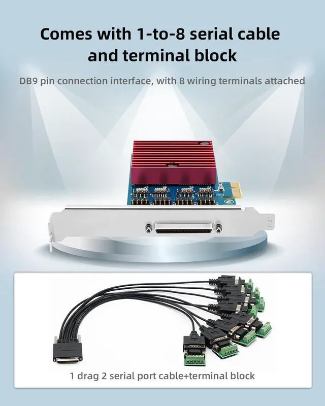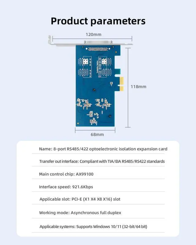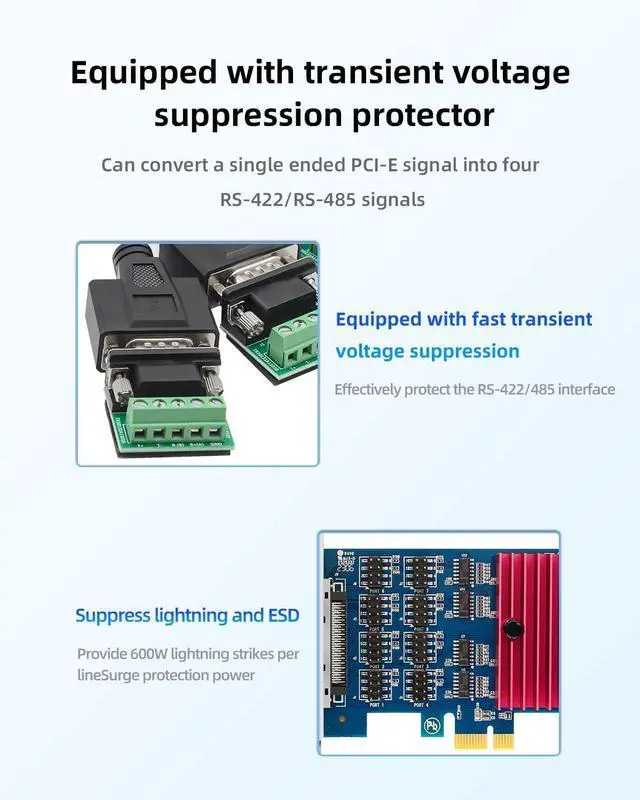 "Broad PCIe Slot Compatibility", Works seamlessly with PCIe X1/X4/X8/X16 slots, converting PCIe signals to balanced RS-422/485 differential signals. Perfect for integrating legacy serial devices (e.g., DR62-to-RS232) into modern systems.