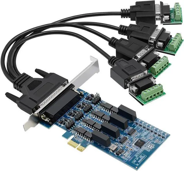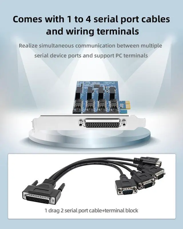 "All-in-One Connectivity Kit", Includes 1-to-4 serial cable + screw terminal blocks for effortless multi-device wiring. RS-485/422 ports support baud rates from 300bps to 120Kbps, ideal for PLCs, sensors, and industrial automation.