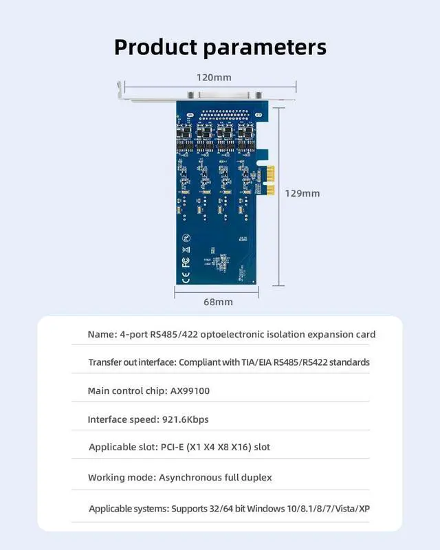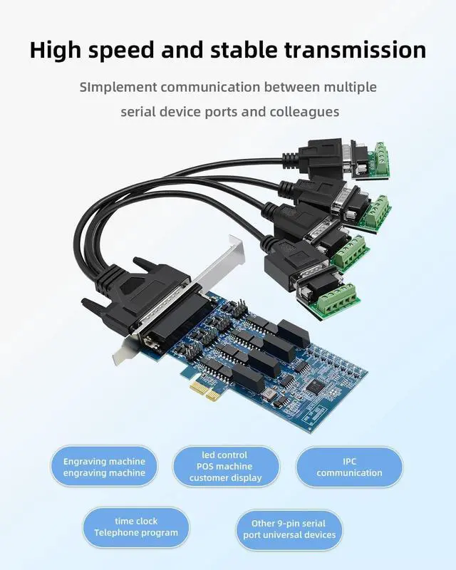 "AX99100 High-Performance Chipset", Features advanced AX99100 PCIe-to-serial controller for ultra-stable operation, ultra-low power consumption (0.5W), and broad compatibility. Achieves speeds up to 921.6Kbps with automatic flow control.