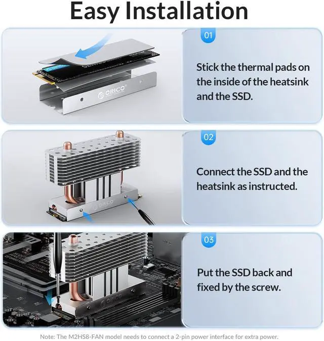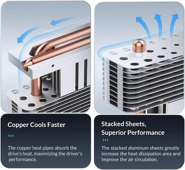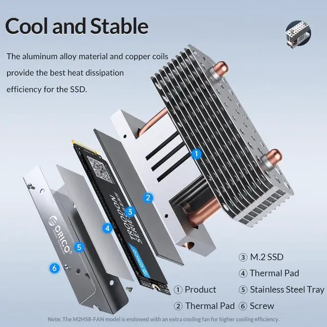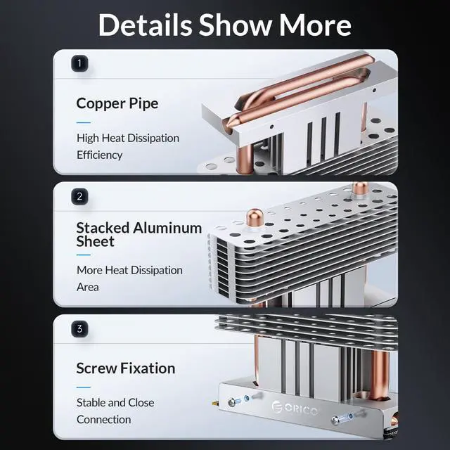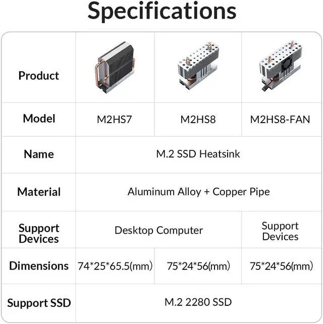 Compatibility support 22 × 80 size single/double sided M. 2-NVME/NGFF solid state drive. Heat dissipation area extend, passive heat dissipation performance. Pure copper heat pipe, double to provide better heat dissipation performance.