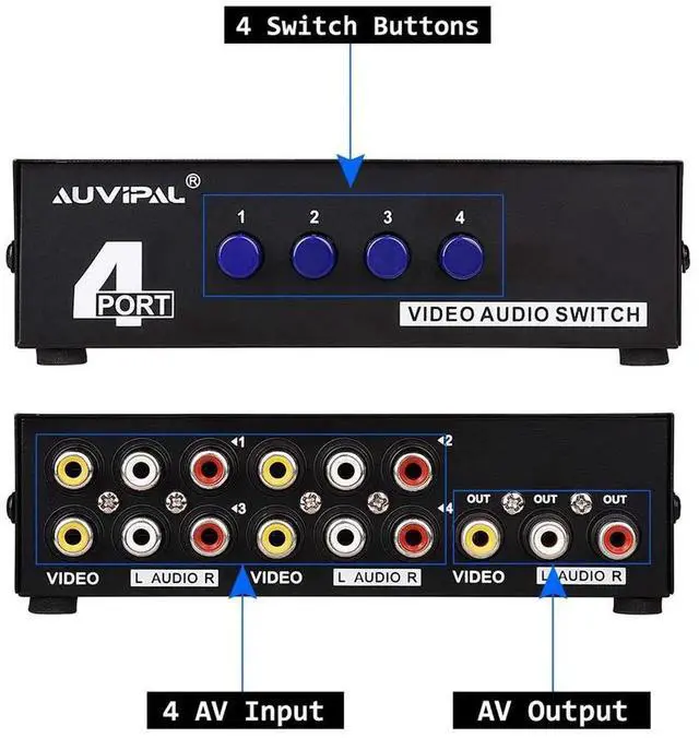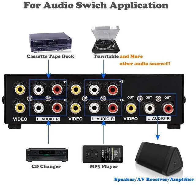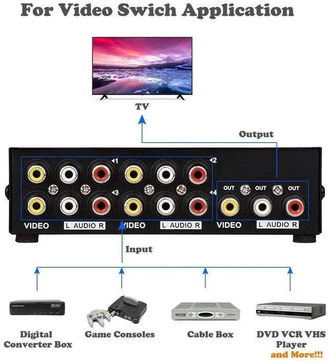4-Way RCA Switch, 4 in 1 Out Composite Switcher, Video L/R Stereo Audio AV Selector Box for DVD VCR VHS AV Receiver PS2 Nintendo Game Consoles
