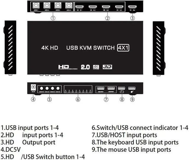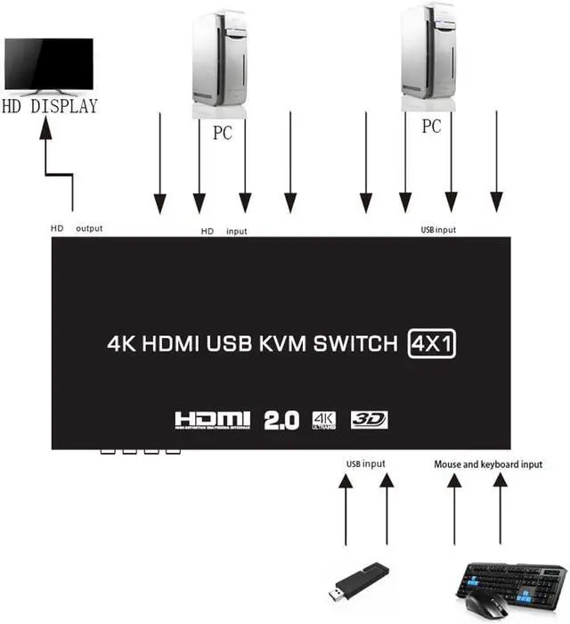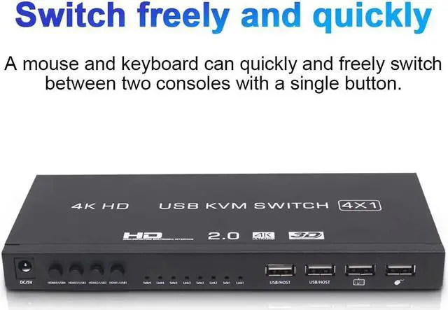 Item Name: USB KVM Switch Set Color: BlackSize (LxWxH): 201x93.1x20 mmOutput: DC 5V/1ASupport video color format: YCBCR 4:4:4Vertical frequency range: 4Kx2K@60HZHDMI-compatible version: HDCP2.2Maximum bandwidth: 18.0 GBPSMaximum baud rate: 600MHZUSB interface protocol: USB 2.0USB PC interface input type: USB-BUSB output interface type: USB-AMaximum working current: 500mAPower adapter format input: 100/-240v (50/60Hz)Operating temperature range: -40 ~ +85Operating humidity range: 5 ~ 90%RH (non-condensing)Support audio format: DTS HD / Dolby TrueHD / LPCM7.1, DTS/Dolby-AC3/DSD HD(HBR)HDMI-compatible resolution: 3840x2160@60Hz/30Hz/1080P (downward compatible)