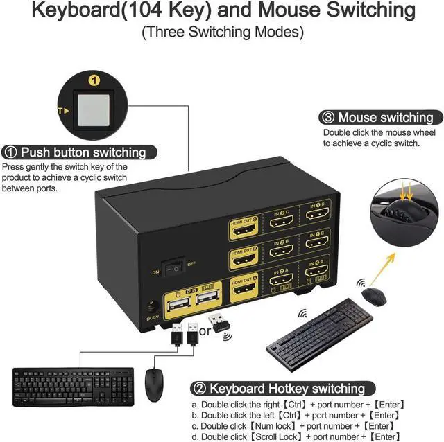 2 in 3 out Triple Monitor KVM Switch HDMIControl 2 computers or Laptops from one set of keyboard, mouse with 3 monitor outputs for extended or mirrored display; premium solution for consolidating 2 computers and get multiple tasks done easier; with separate speaker and microphone output;