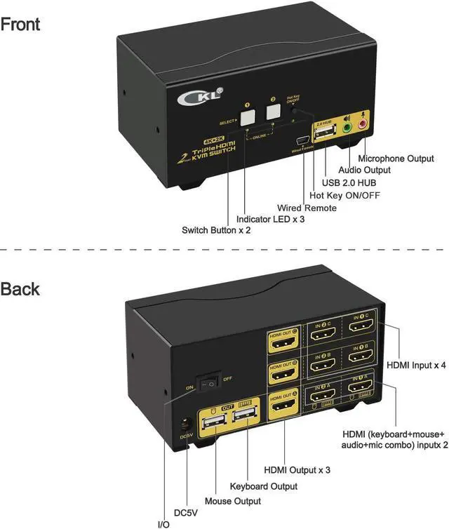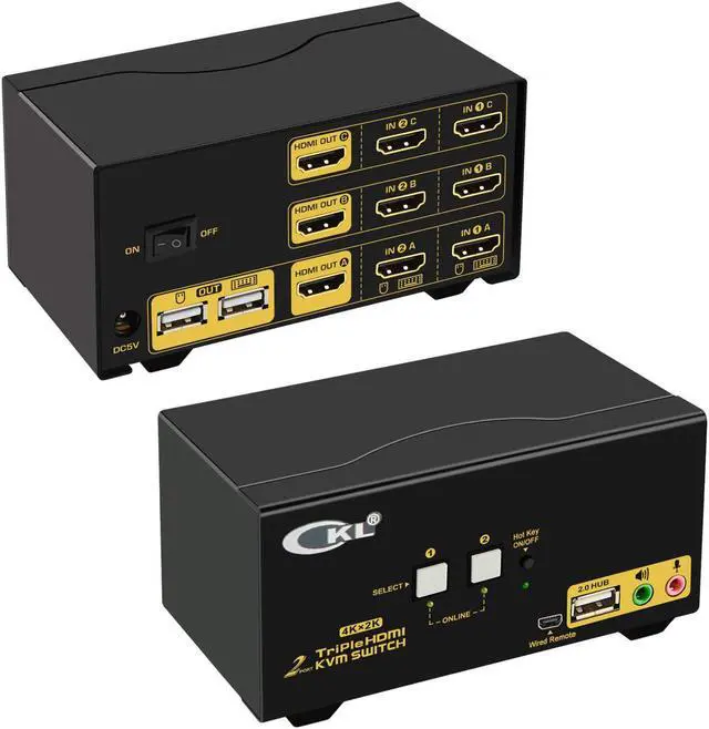 CKL Triple Monitor HDMI KVM Switch 2 Port with Audio and USB 2. 0 HUB, PC Monitor Keyboard Mouse Switcher Box Mirrored or Extended Display 4K@30Hz for Computers and Laptops CKL-923HUA
