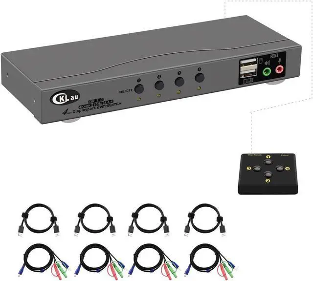 1. DisplayPort Switch KVM Displayport: allows up to 4 computers sharing one set of keyboard & mouse and 1 monitor. With all input cables, with audio and mic output. (this KVM switch is DP 1.2 version, it doesn't compatible DP 1.4 devices and 144Hz, 120Hz, 100Hz refresh rate)