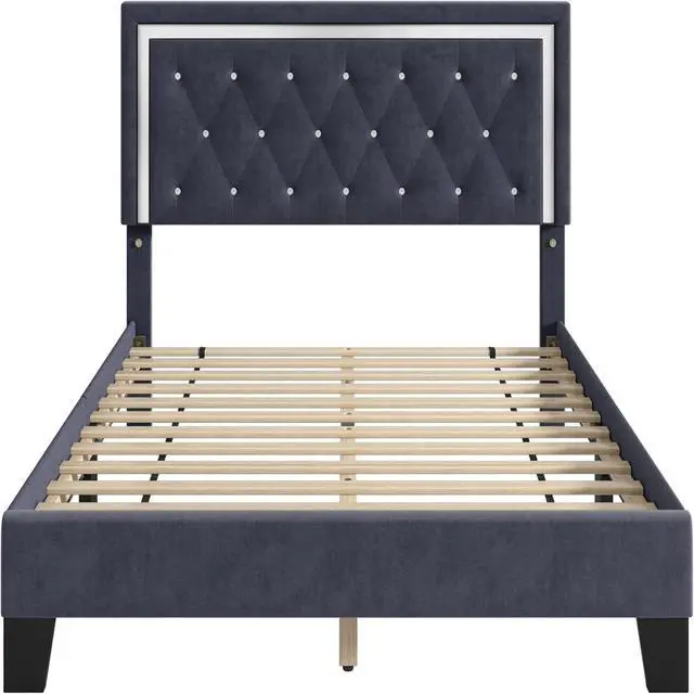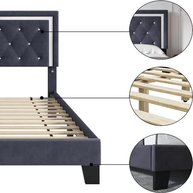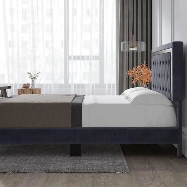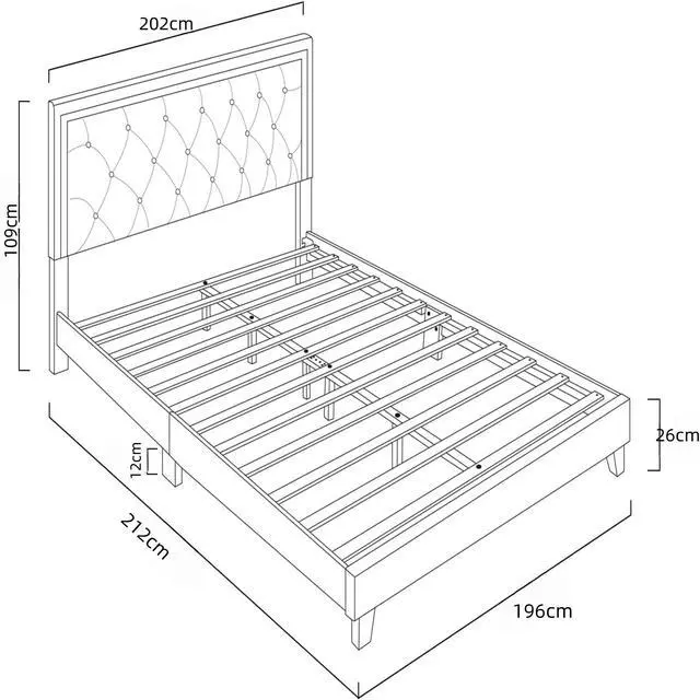 The King Size Upholstered Bed Frame with Diamond Tufted Headboard blends luxury and function with dark blue velvet, crystal button accents, and sturdy wood slats. No box spring needed, this platform bed features solid wood and metal support, ensuring quiet, durable use. Modern style meets easy assembly for a timeless upgrade to any bedroom. Size: King | Color: Dark Blue | Material: Velvet + Solid Wood + Metal | Dimensions: 212 x 202 x 109 cm | Style: Modern Luxury | Assembly Required.
