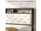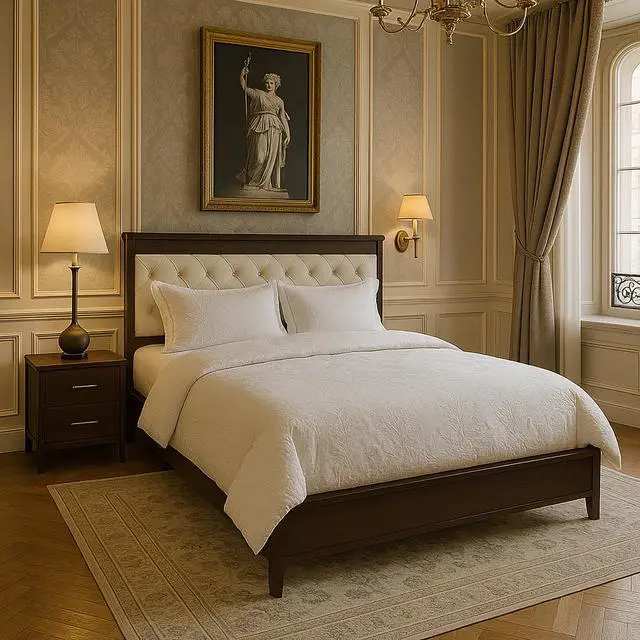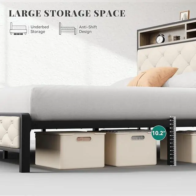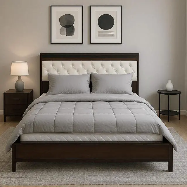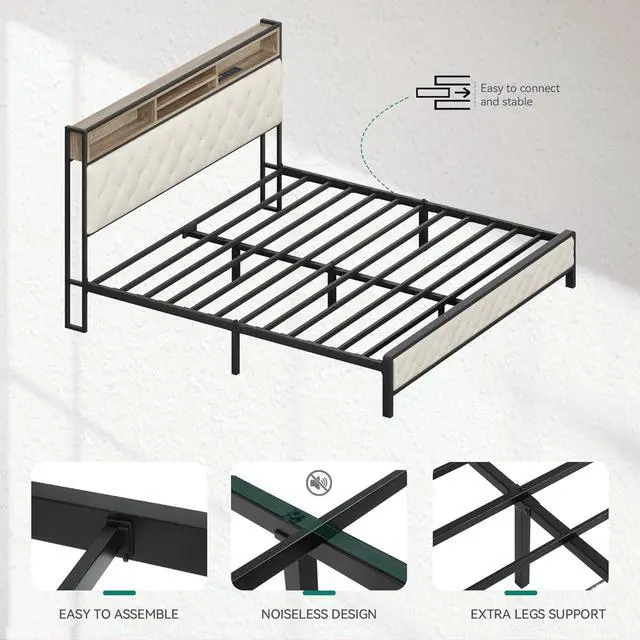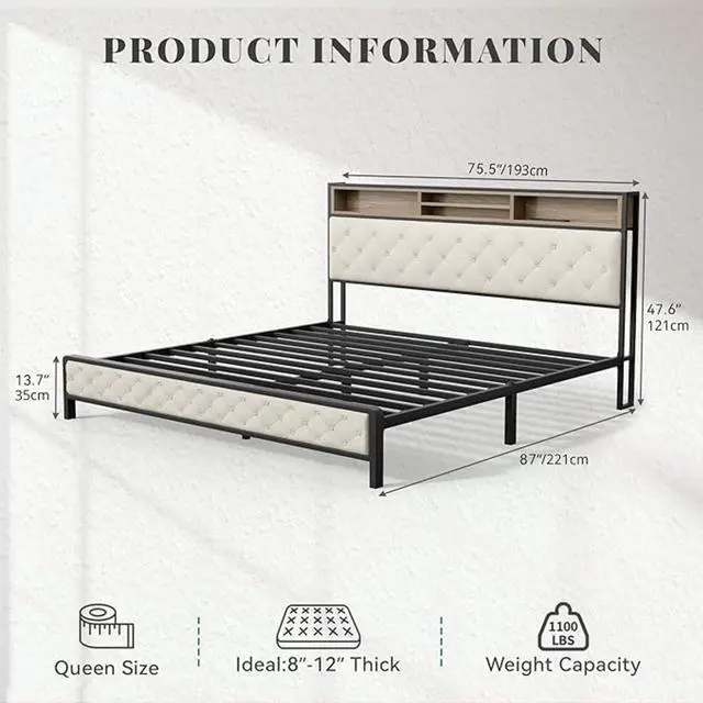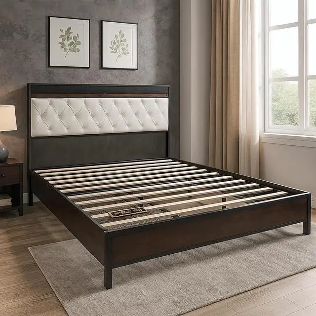 This King-Size Bed Frame (193 x 203 cm) features a tufted, upholstered headboard, a sturdy platform base, and reinforced slats for strong, noise-free mattress support. The sleek dark wood and black finish pair with a cream fabric headboard for a stylish, modern look. No box spring needed, assembly is fast with tools included. Product Type: King Size Bed Frame | Headboard: Cream Tufted Upholstery | Finish: Dark Wood + Black Accents | Size: 193 × 203 cm | Weight Capacity: 800 lbs | Assembly: Tools Included.