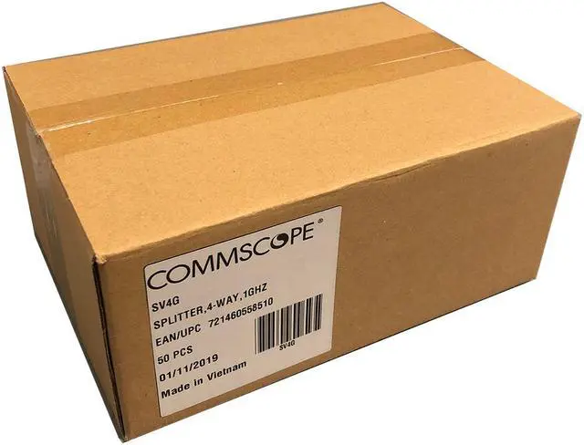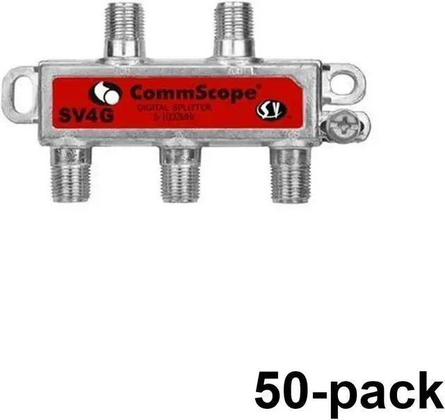SV4GHomeConnect® Four-way Splitter, 5–1002 MHz - 50 Pack CommScope offers a number of coaxial splitters, which are manufactured to the highest standards to ensure that active components in the network function efficiently and effectively. They pay special attention to soldering, sealing, and the use of non-ferric-based designs to prevent network interference such as passive intermodulation (PIM), which can be caused by corrosion, oxidation and insufficient contact pressure.