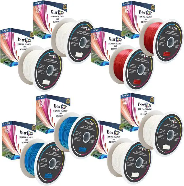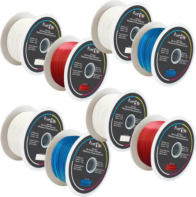 8 Packs of 1st Grade PLA like SILK Filament for 3D Printers. 4 White, 2 Red, & 2 Blue Colours, 1.75 mm Diameter. Net Material Weight on Each Spool is 1 Kg ( 2.2 Lbs), a Total of 8 Kg ( 17.6 Lbs) Net. High-gloss Formula with Outstanding Smooth Shiny Surface Finish Prints.