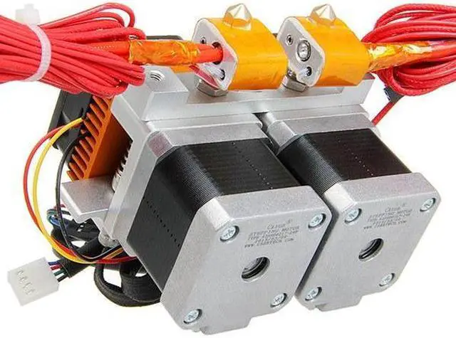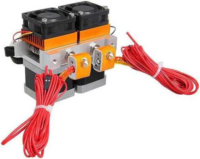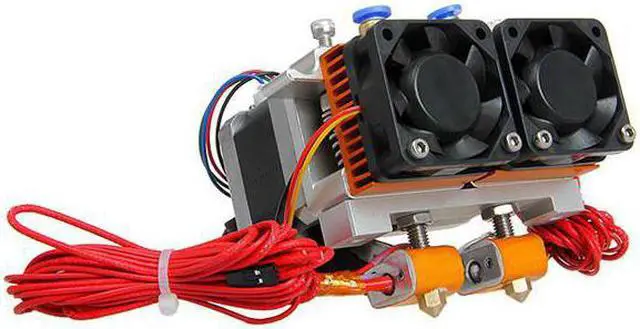 This is a Dual Extruder which can be used on 3D printers like Mendel, Prusa, Makerbot, and Printrboard and others. The two print heads are conjoined with a piece of high hardness aluminum bar with good heat dispersion and high reliability. The main benefits of this Dual Extruder includes being able to print more complex objects with support structures and more aesthetically pleasing objects that feature multiple colors or multiple materials. The possibilities are only limited by your imagination.