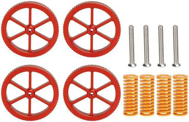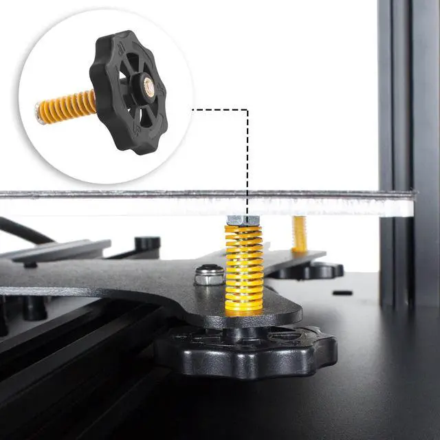 Package Includes: 4pcs hand twist leveling nut, 4pcs hot bed spring, 4pcs screws.