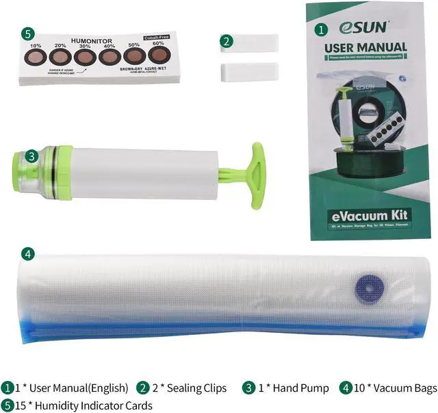 Sealing air valve and double sealed zipper for air tight protection. The vacuum set is widely designed for 99% FDM 3D printing filaments, it can be used for eSUN and other FDM brands.