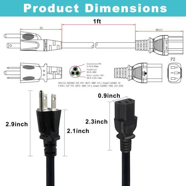 • PRODUCT SPECIFICATION: Wire Gauge: SJT 16AWG/3C. Rated to carry: 125V at 13A,1625W. Length: 1FT. Connector: NEMA 5-15P to IEC320-C13. Package List2PCS 1FT computer monitor power cord