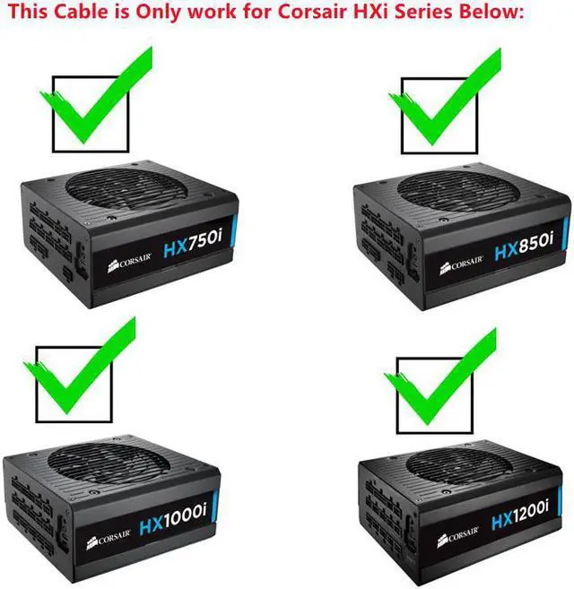 Compatibility: For Corsair HXi Series Full Modular PSU HX750i HX850i HX1000i HX1200i Note: Because the voltage and line sequence of each power module port is different. If your power supply model is not mentioned above, please check compatibility with our customer service before you buy! Contact us if you need other types of Modular power cables. (8Pin, Dual 8Pin, SATA, IDE, CPU, 24Pin Main Power)