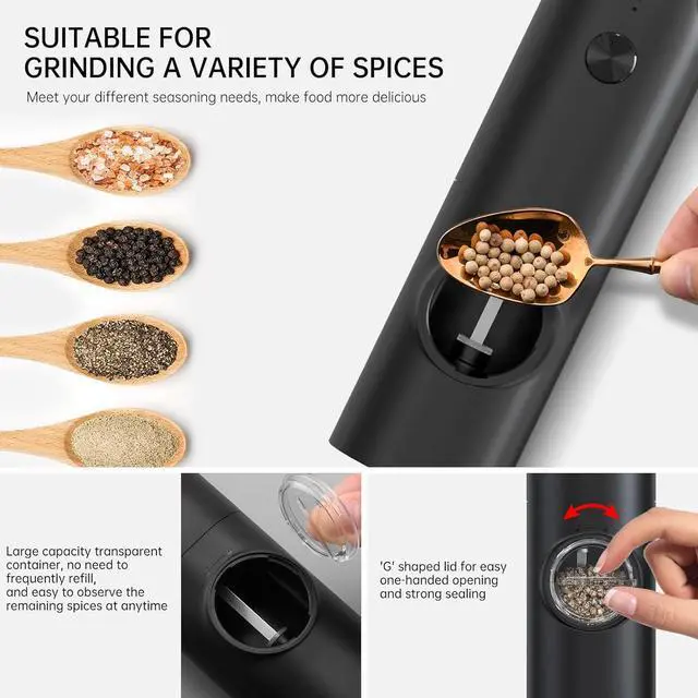 'G' shaped lid is for easy one-handed opening and strong sealing. The interior has a large capacity space so you do not need to refill spices frequently