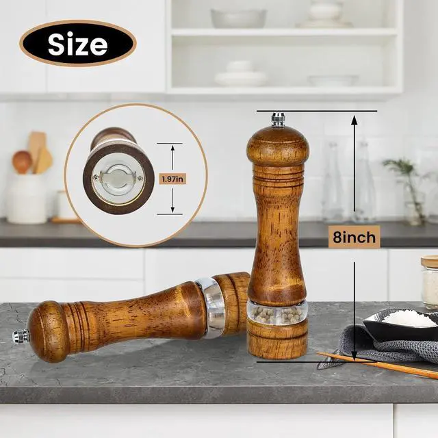 8 Inches Wood Salt and Pepper Mill Set of 2, Pepper Grinders with Transparent Window - Salt Shakers with Adjustable Ceramic Rotor, Ideal Tool for Kitchen