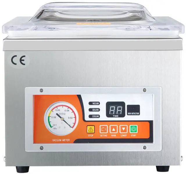 Chamber Size(L x W x H): 13 x 10.6 x 2 in / 33 x 27 x 5 cm,Product Size(L x W x H): 16.1 x 12.6 x 11.8 in / 41 x 32 x 20 cm,Voltage: 110V / 60 Hz,Model: DZ-260A,Vacuum Pump Rate: 6.5 m/h,Motor Power: 180W,Sealing Power: 260W,Material: Stainless Steel,Suction Speed: 3.8 CFM,Net Weight: 48.5 lbs / 22 kg,Max. Sealing Size: 13 x 9.8 in / 33 x 25 cm