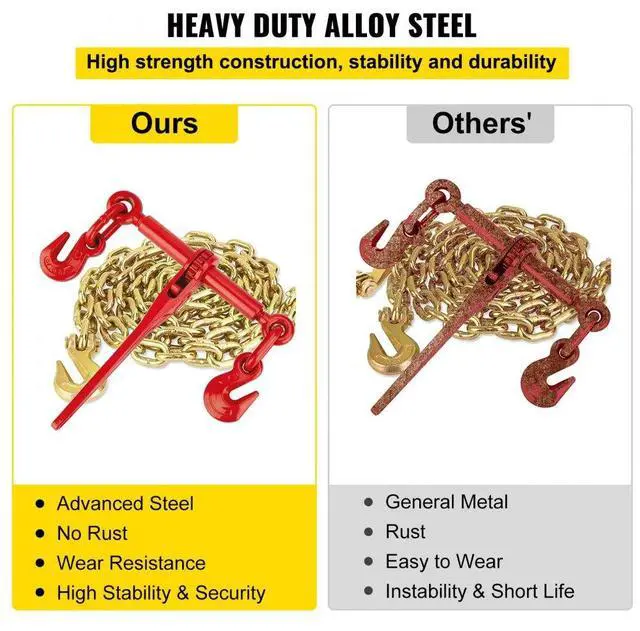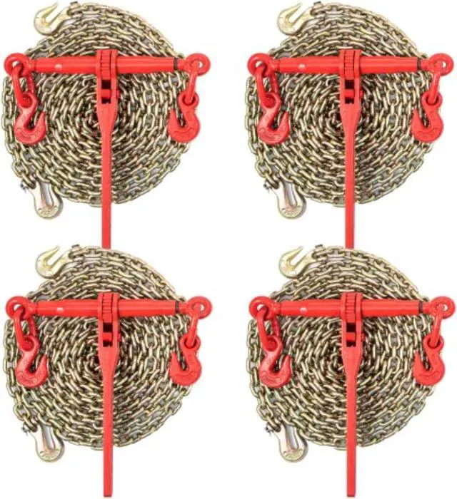 Chain Secure Working Load Limit: 4,700 lbs / 2.1 Ton,Color: Red,Breaking Strength: 22,000 lbs / 10 Ton,Material: Alloy Steel,Compatible Chain Size: 5/16 in / 8 mm,Chain Length: 21 ft / 6.4 m,Binder Secure Working Load Limit: 6,600 lbs / 3 Ton,Handle Length: 13 in / 33 cm,Chain Specification: 8 24 mm,Model: VV-RB-4C,Package Weight: 92.59 lbs / 42 kg,Finish: Galvanized,Chain Diameter: 5/16 in / 8 mm